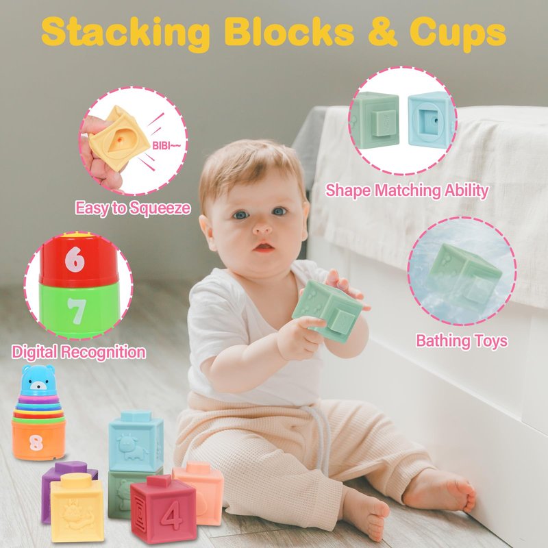 - Stacking Blocks & Cups: Soft baby building blocks can be stacked, squeezed, and chewed. And paired with stacking cups, helping babies learn colors; numbers; animals. Suitable for infants teething, suitable for children aged 6 months and up