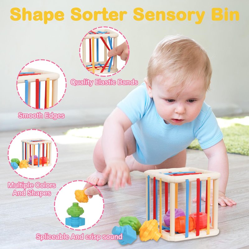 - Sensory Shapes & Storage Bin: This toy contains a cube with colored elastic bands and 6 blocks of different colors and shapes. Its corners are rounded and soft, ensuring safety. Shaking the block will make a crisp creaking sound