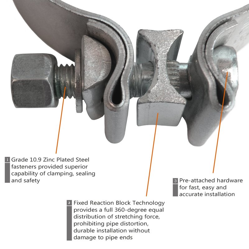 - Fixed Reaction Block Technology provides a full 360-degree equal distribution of stretching force, prohibiting pipe distortion, Durable installation without damage to pipe ends
