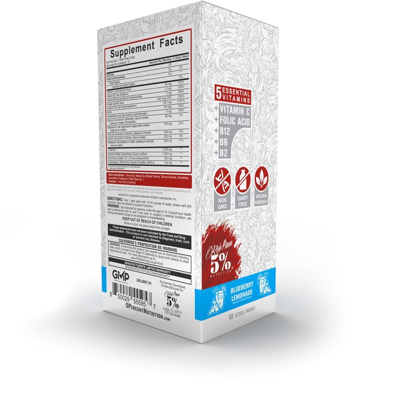 5% Nutrition Hydrate Stick Hydration Packets | Sport Electrolyte Powder Mix Packets with Coconut Water | 2-Pack | (Blueberry Lemonade + Lemon Lime)