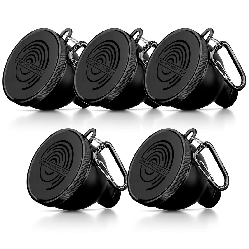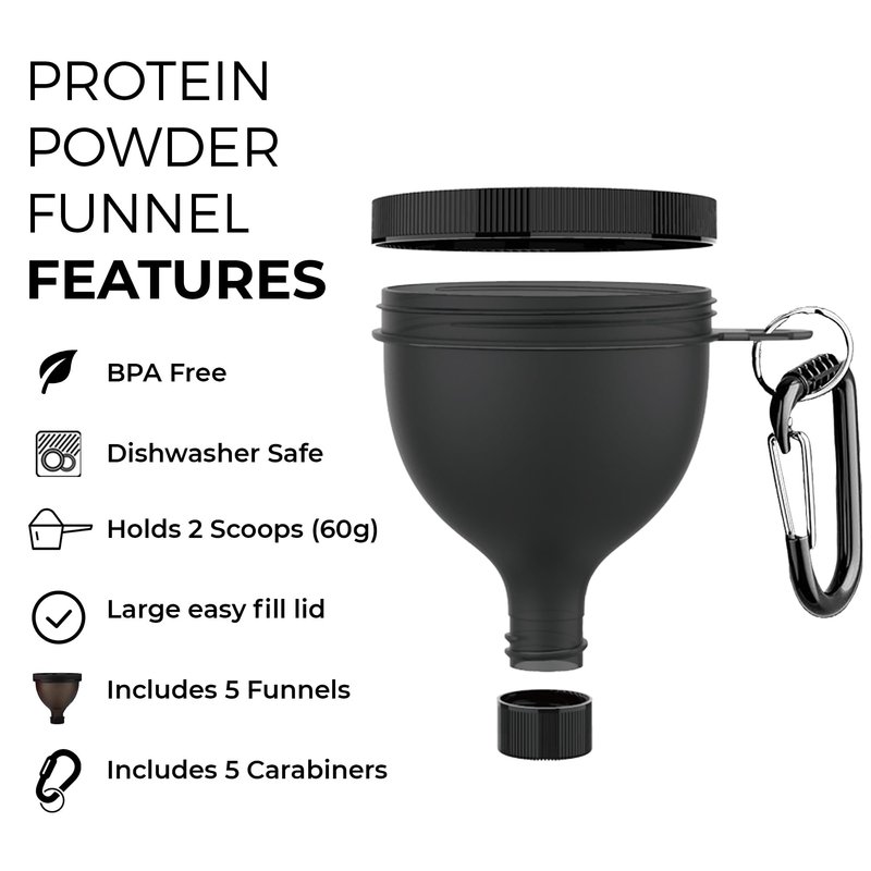 [5 Pack] Protein Powder Funnels Multipack with Carabiner Keychain, Portable Supplement Containers for On-the-Go and Travel, Protein & Pre-Workout Powder Funnel for Water Bottles & Shakers | Black Plain