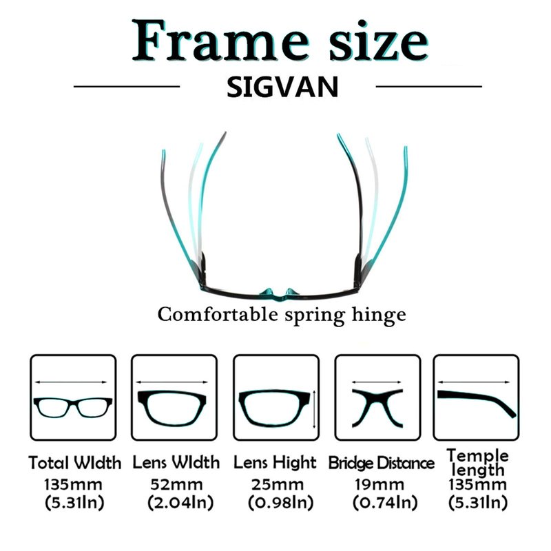 - Products Size: Lens width: (52mm),Frame width: (135mm),Lens height: (25mm),Bridge (DBL): (19mm),Temple length: (135mm).Frame material: plastic.Spring hinge: Yes.Head size: Narrow to Medium.