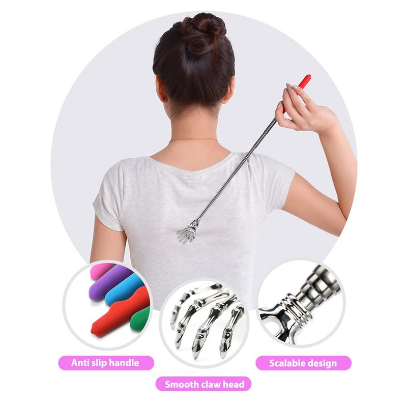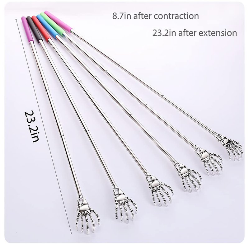 This is a retractable metal back scratching device with smooth hand bone shaped claw head, stainless steel telescopic rod and rubber handle, which can solve your itching problem. It can avoid scratching the skin with nails and scratch the itching parts that are difficult for you to touch. It is only 8.7in after contraction, which is very convenient to carry. It is 23.2in after elongation, which can scratch all the itching parts of the body. And durable, suitable for family or gift to your friends.