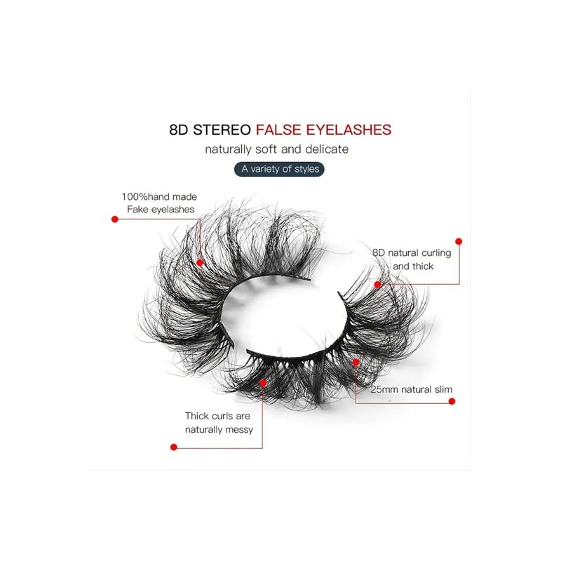 8D Stero False Eyelashes. 100% handmade lashes. 8D natural curling and thick. Natural messy look. 25mm natural slim and flexible lash. Volumized and wispy. Mink and fluffy. 5 pairs included on pallet.