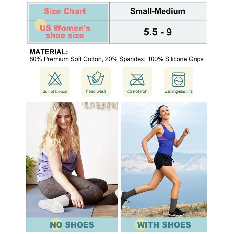 - ✅FIT JUST RIGHT - One Size fits Women’s US shoe size 5.5-9. These adult grippy socks are perfect for yoga, pilates, bikram, barre, ballet, studio, gym or dance. Also ideal for hospital socks, floor socks, physiotherapy, elderly care, pregnancy and more to prevent falls from stairs, or the floor.