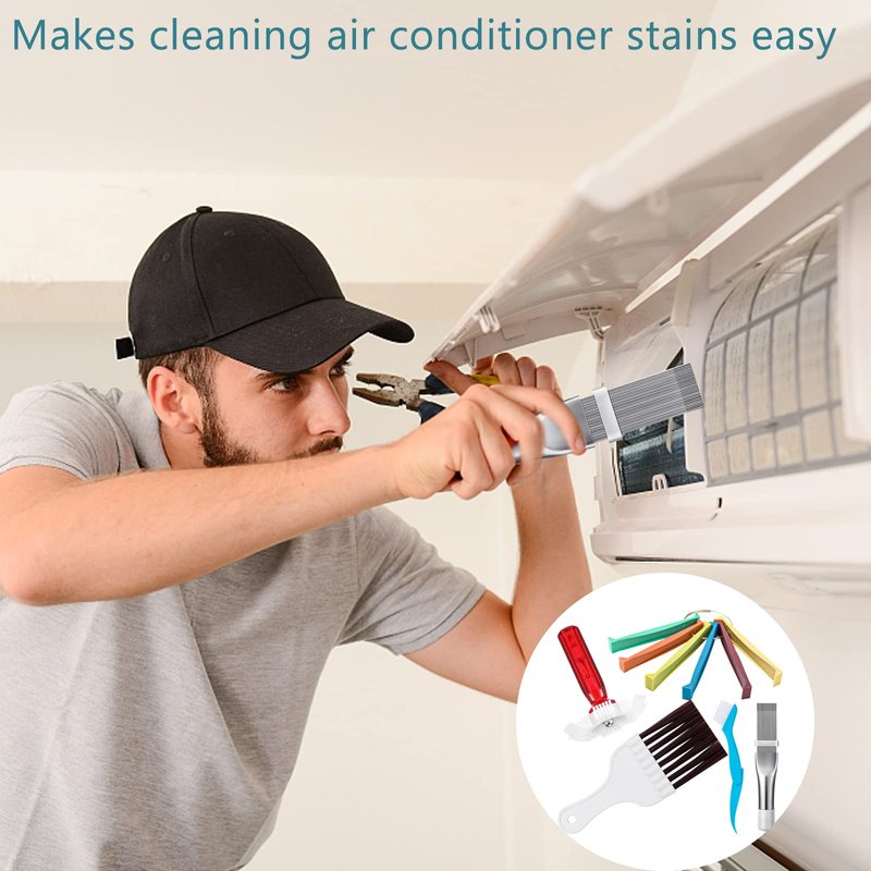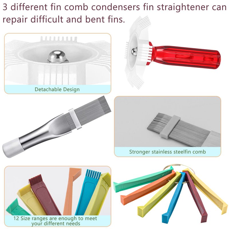 - 【Evaporator Coil Cleaner Good Helper】AC fin comb is divided into variety of 6 colors,easy to distinguish.Cooling fin comb the teeth are about a quarter inch deep,suitable for many fin size applications.Large white brush in the air conditioner coil cleaner can quickly clean up dust in a large area and the foldable blue condenser coil brush is suitable for deep cleaning of details.Fin comb combination use,let your the air conditioner has been refurbished.