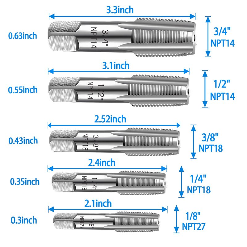- Versatile Size Range: This NPT tap set includes 5 pipe fitting sizes - 1/8", 1/4", 3/8", 1/2", and 3/4" - providing versatility for various pipe threading needs; the nominal size of the National Pipe Taper taps corresponding to the size of the pipes fitting to be tapped