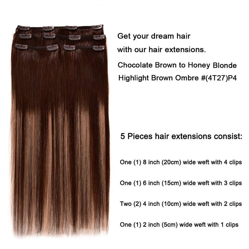 5 Pieces 18" Remy Clip in Hair Extensions Human Hair Chocolate Brown to Honey Blonde Highlight Brown Ombre - Silky Straight Short Thick Real Hair Extensions for Women (18 inches, (4T27) P4, 90grams)