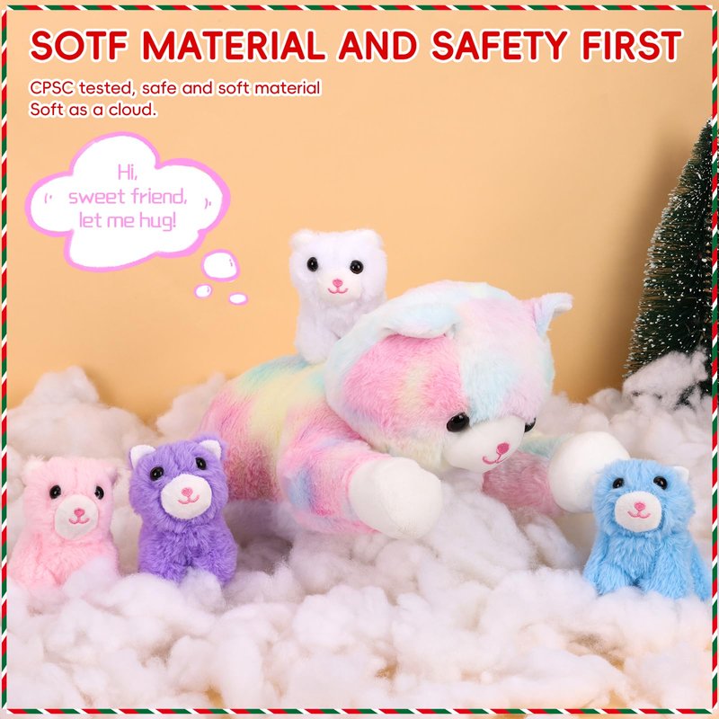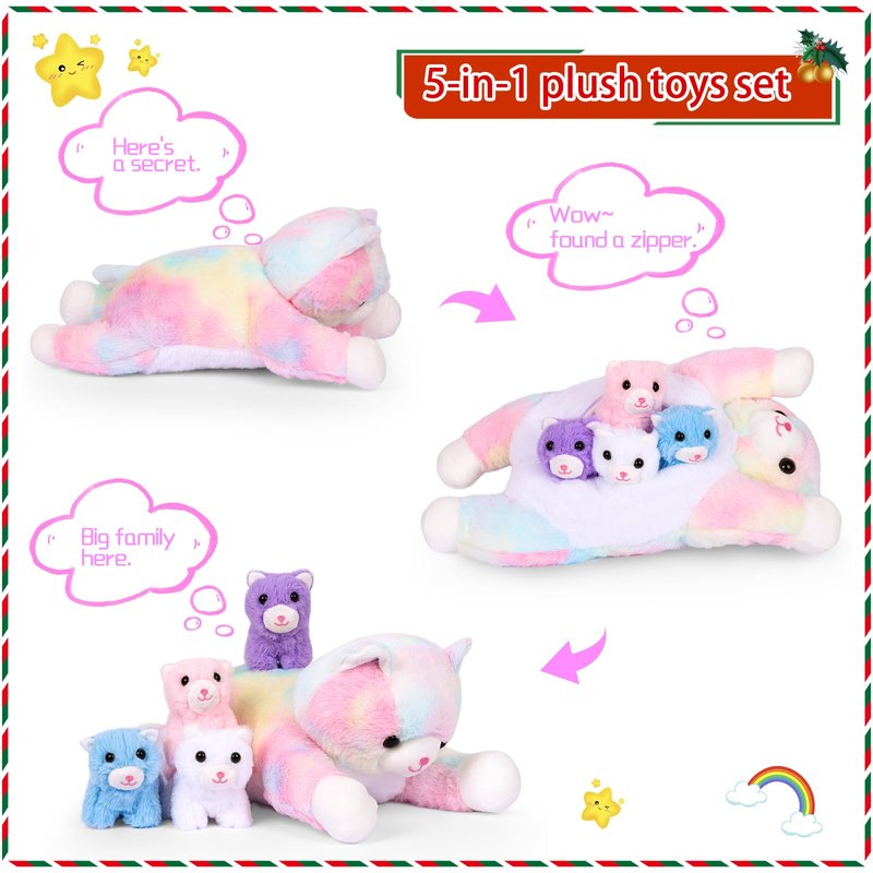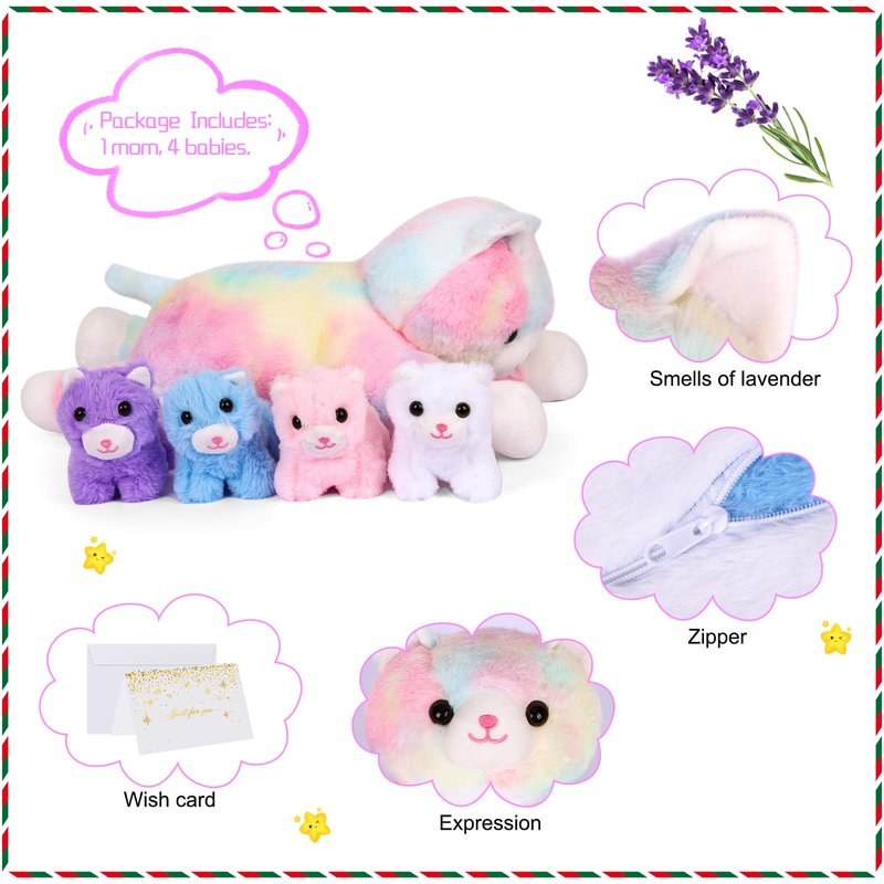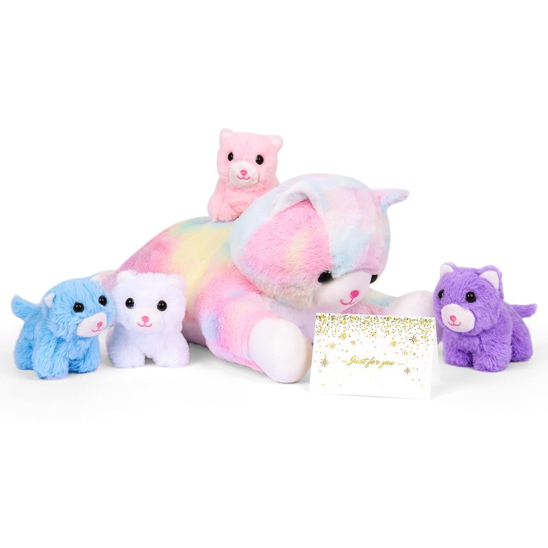 - Stuffed Animals Set: Includes 1 plush colorful mom cat and 4 baby kittens in white, lavender, pink, and blue; Rich and cute shapes; Promotes social skills and creativity in children; Perfect for sharing with friends