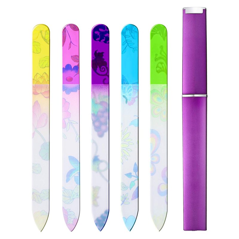 5 Pieces glass nail file buffers with cases, colorful printed finger nail files crystal glass nail buffers multicolor double sided manicure tools with protective cases for women men
