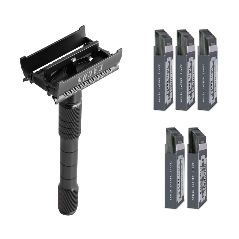 50 BLADES + Facón Classic Long Handle Double Edge Safety Razor - Butterfly Open Shaving Razor With Platinum Japanese Stainless Steel Blades for Smooth Wet Experience - 200+ Shaves