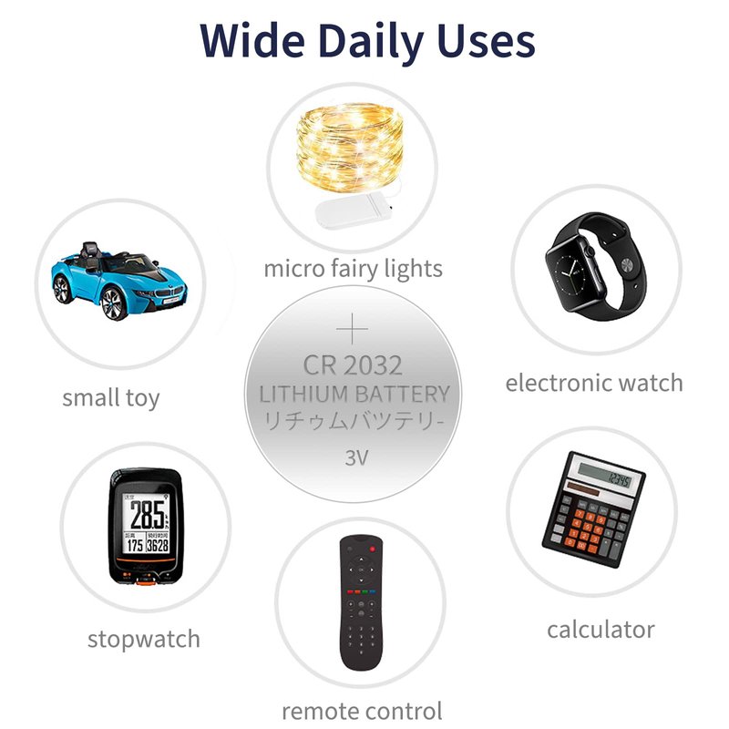These CR2032 lithium coin cell batteries can be widely used for battery operated fairy lights, watches, calculators, key fobs, Apple TV remotes, alarm clocks, computer motherboards, electronic organizers, garage door openers, toys, games, MP3 players, digital voice recorders, door chimes, pet collars, LED lights, sporting goods, pedometers, calorie counters, stopwatches, glucometers, thermometer, medical devices, security devices, and other small electronics.