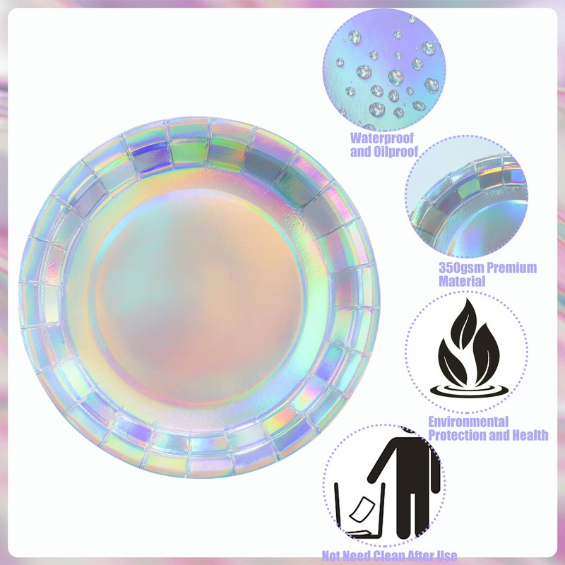 - 7in &9in: holographic paper plates have two dimensions: 7 inches and 9 inches, which can be applied for lunch, dinner, dessert and appetizer, or as the charger plate; the shiny plates can hold sandwiches, tacos, salads, soups, cupcakes as well as treats.