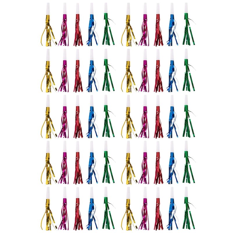 Get ready to make some noise with these fun and colorful party horns! This 50 pack of noise makers includes 5 colors with 10 pieces of each to ensure you can add life and noise to a parade, birthday party, or graduation ceremony. Cheer on party guests, ring in the New Year, or celebrate the birthday boy or girl by using these decorative noisemakers.