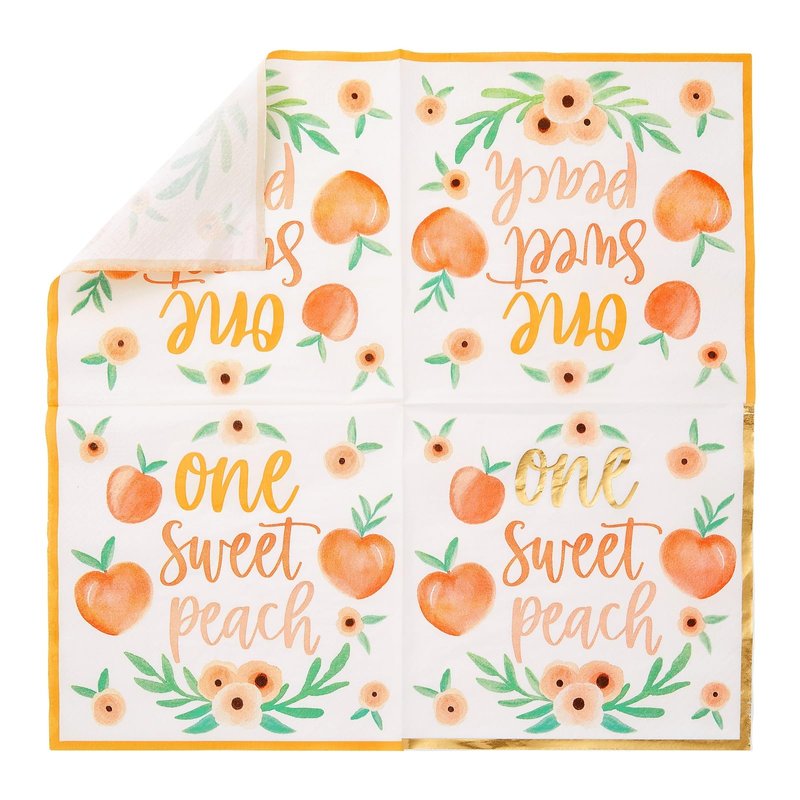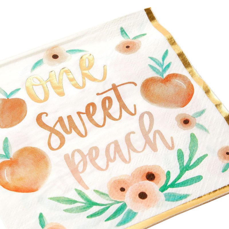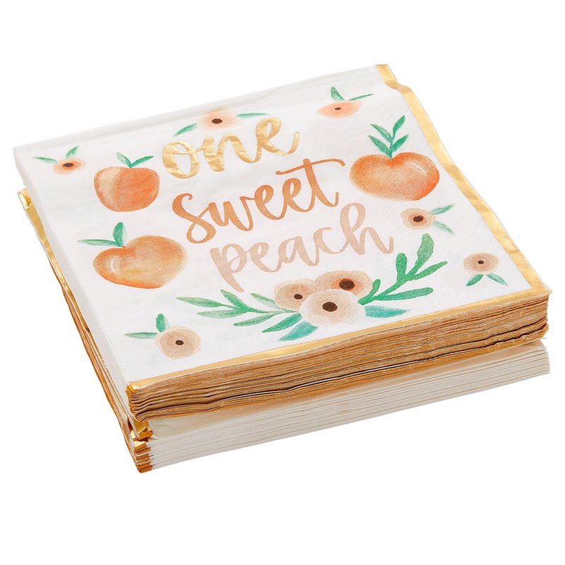 - Peach Party Decorations: Elevate your table setting with these peach napkins featuring an elegant gold border and delicate floral accents, with "One Sweet Peach" written in a script font