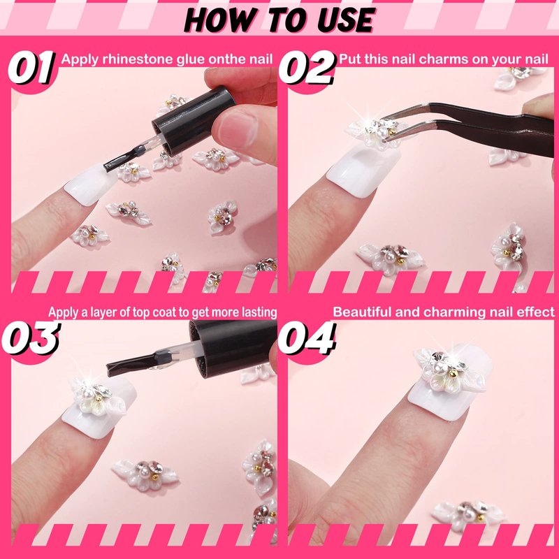 - Rhinestones and Pearls: the acrylic nail flowers charms are inlaid rhinestones and pearls, shiny and glittering, can help to match your daily outfits and styles, making you more attractive and elegant among people