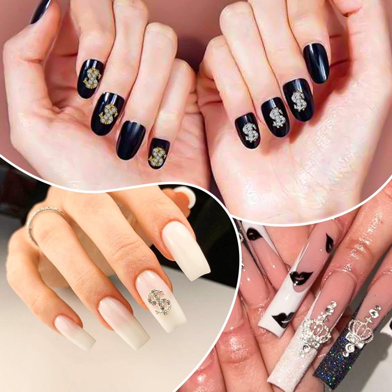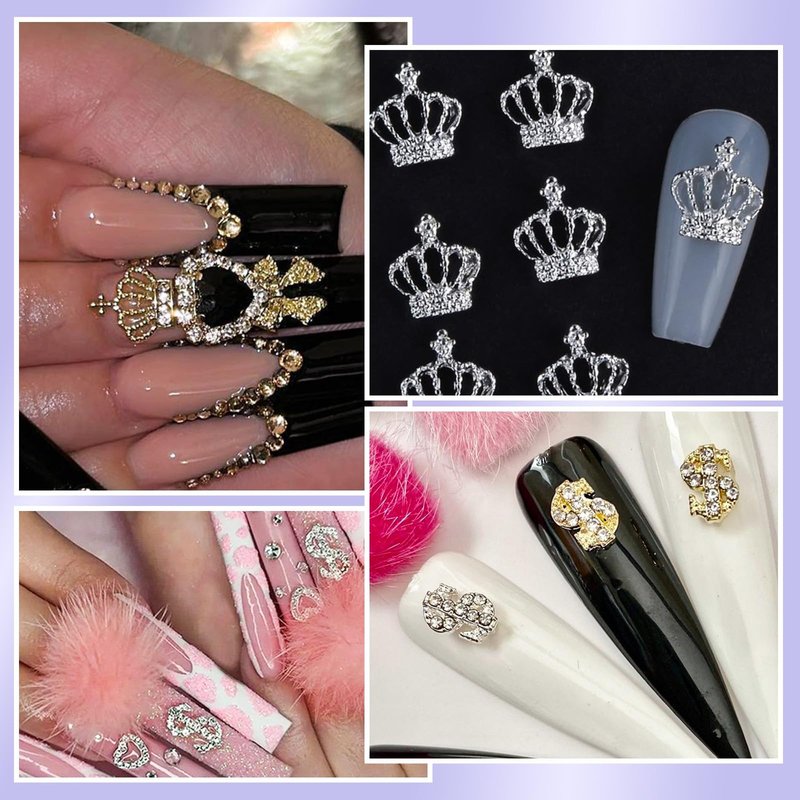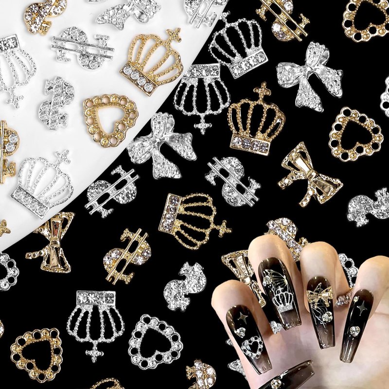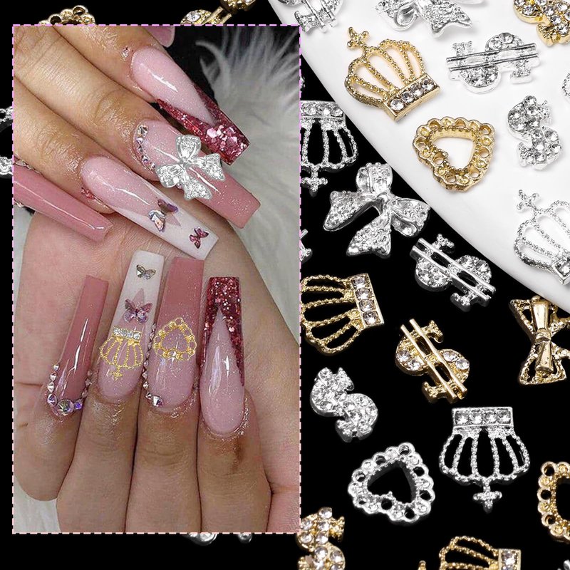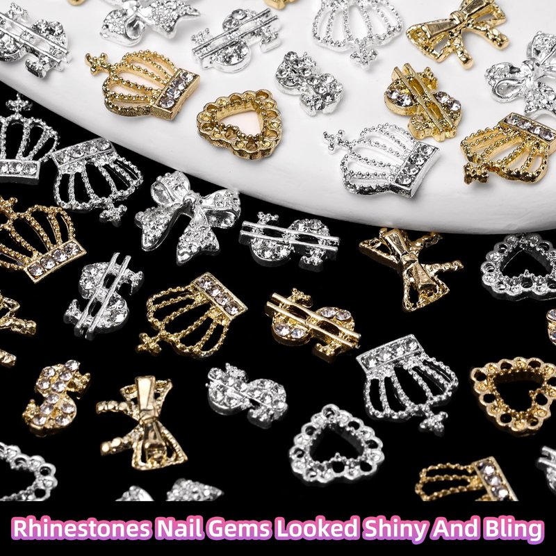 These are 10 styles nail gems of shapes, like silver gold bows charms for nails, crowns nail charms, heart nail charms and dollars nail charms gems. You can have a lots design nails art and make them shine and eye-catching