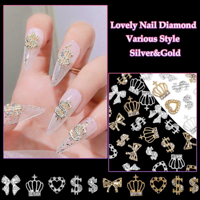 - Rich Styles Nail Gems: These are 10 styles nail gems of shapes, like silver gold bows charms for nails, crowns nail charms, heart nail charms and dollars nail charms gems. You can have a lots design nails art and make them shine and eye-catching