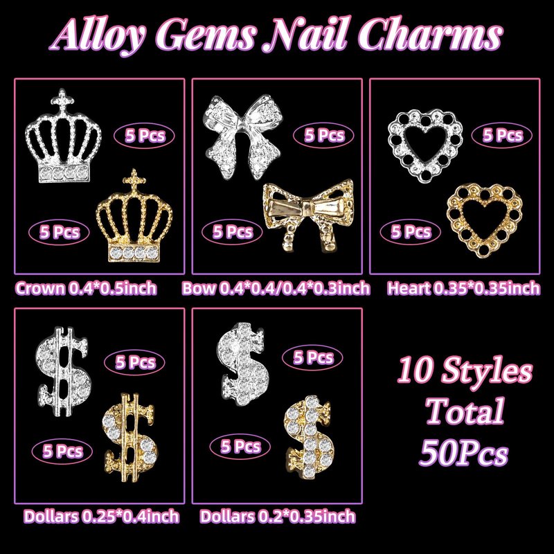 - Nail Charms Kit: You will receive a pack of 10 styles of nail charm gems, 50 pcs in total. Enough quantity and styles for you to choose from. This rhinestones nail charms maked it easy for you to make any nail art you like and will bedazzle your nails