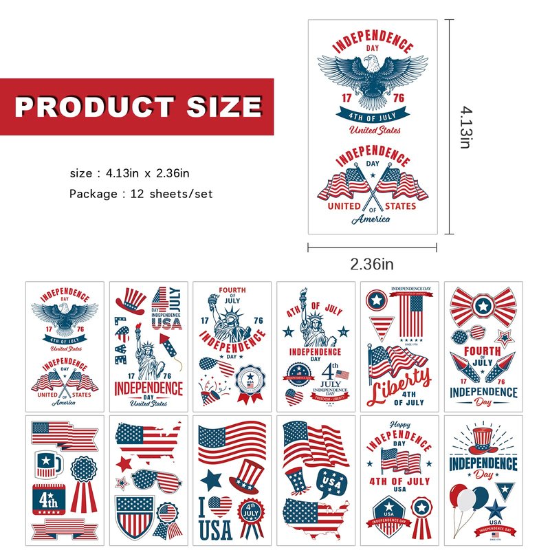 - 12 Sheets 50 Pcs 4th of July Tattoos, each sheet size is 4.13*2.36 inch(10.5*6 cm).