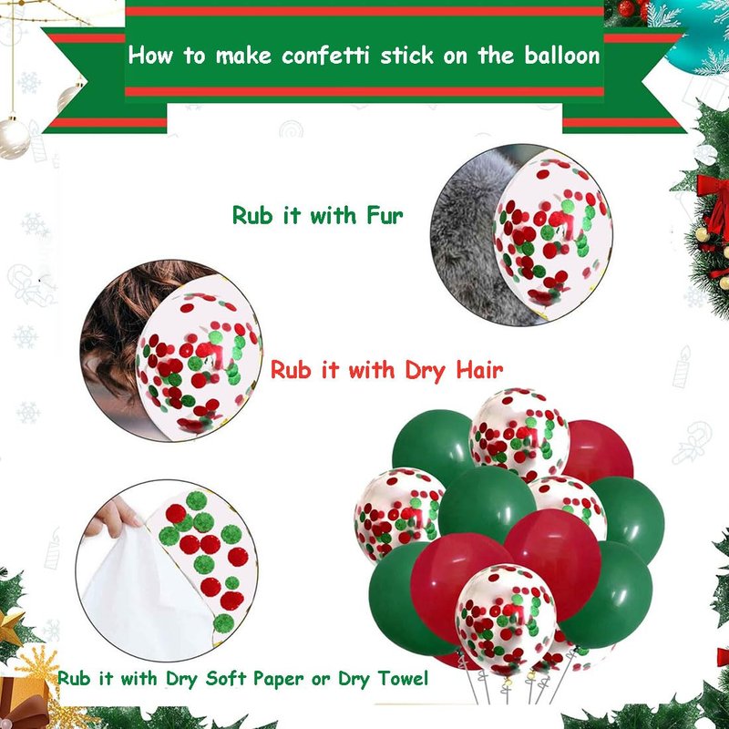 - 【Red and Green Balloons】Each sets contains 20pcs Red Latex Balloons 20pcs Green Latex Balloons and 10pcs Red and Green Confetti Balloons.The right amount quantity and most suitable color for Christmas party decoration