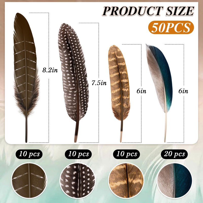- Value Pack: You will receive 4 styles natural turkey feathers, 50 pieces in total. Sufficient quantity to meet your feather needs at any event.