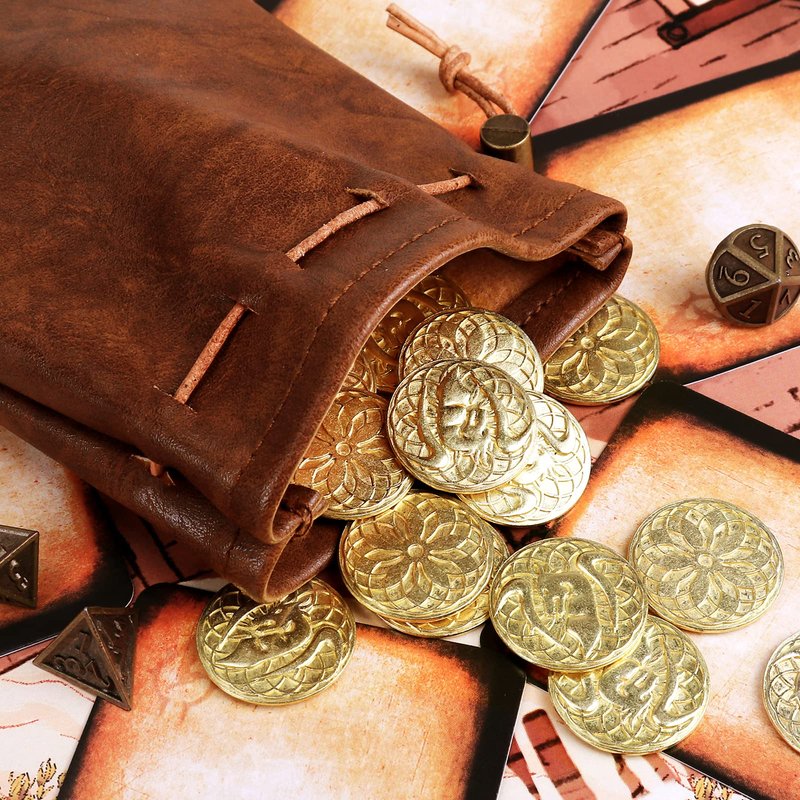 - 【Durable Leather Bag Accessory】Byhoo fantasy golden metal coin set include a brown leather bag. This great a accessory is practical and cool. The touch and appearance of this bag is full of the style of magic old world. And this bag can even hold 100 D&D coins. You can bring more game tokens or dice to various DND meetings and game parties