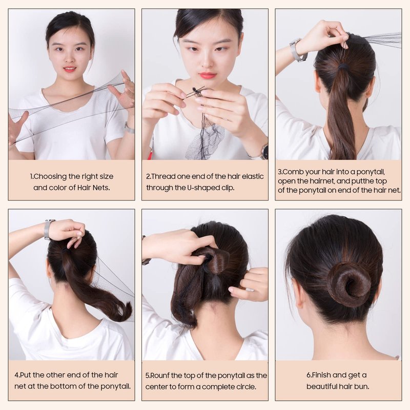 - 【Quick & Easy】Elegant hair bun effortlessly in 5 seconds and they can hold your hair well without loosening or falling off. Step 1: Pull the bobby pins through the hairnet and insert them into the entire ponytail. Step 2: Twist the ponytail into an upward twist to make a bun. Step 3: Secure with bobby pins. Choose a color as close to your hair color as possible, so it is not easy to see the hairnet.