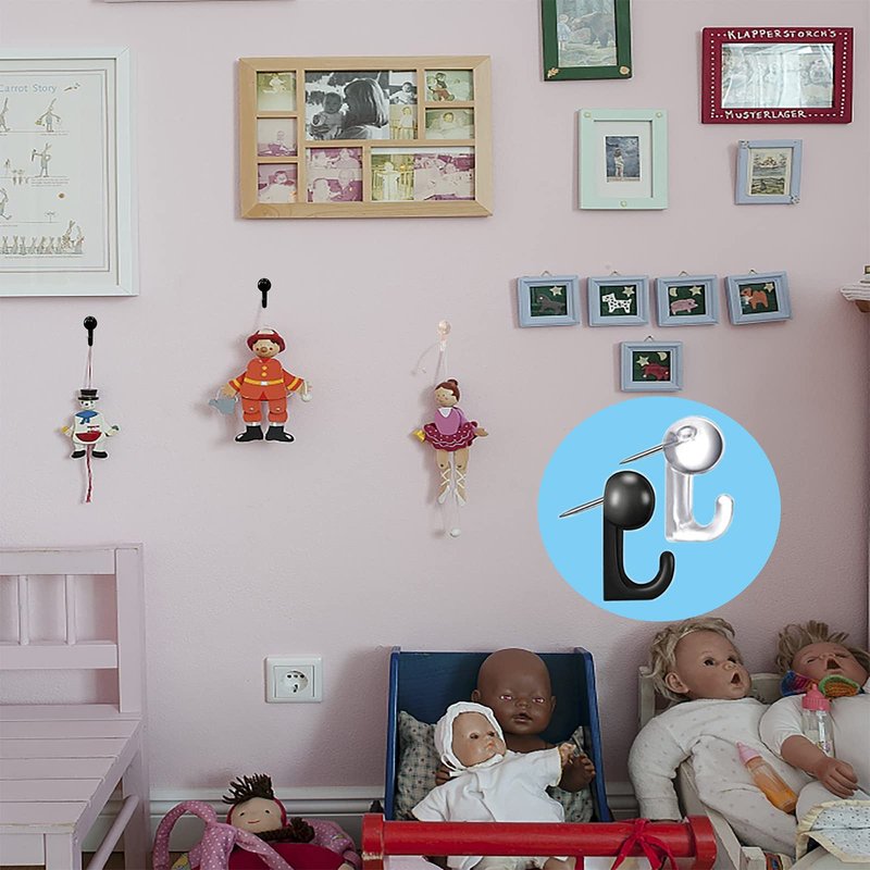 - 【Product Size and Package】Push pin picture hooks comes with a transparent box, including 50pcs hooks with two colors(clear and black), 50pcs is enough for hanging different small items in different places.