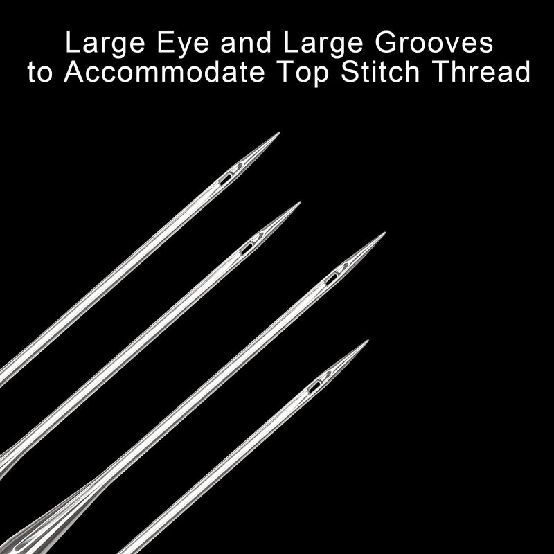 - Great Design: The sewing Needles shank one side is flat and one side is semicircle, has an enlarge eye and large grooves to accommodate top stitch thread. A sharp needle can helps you stitch perfectly straight lines and even stitches, and work very smoothly.