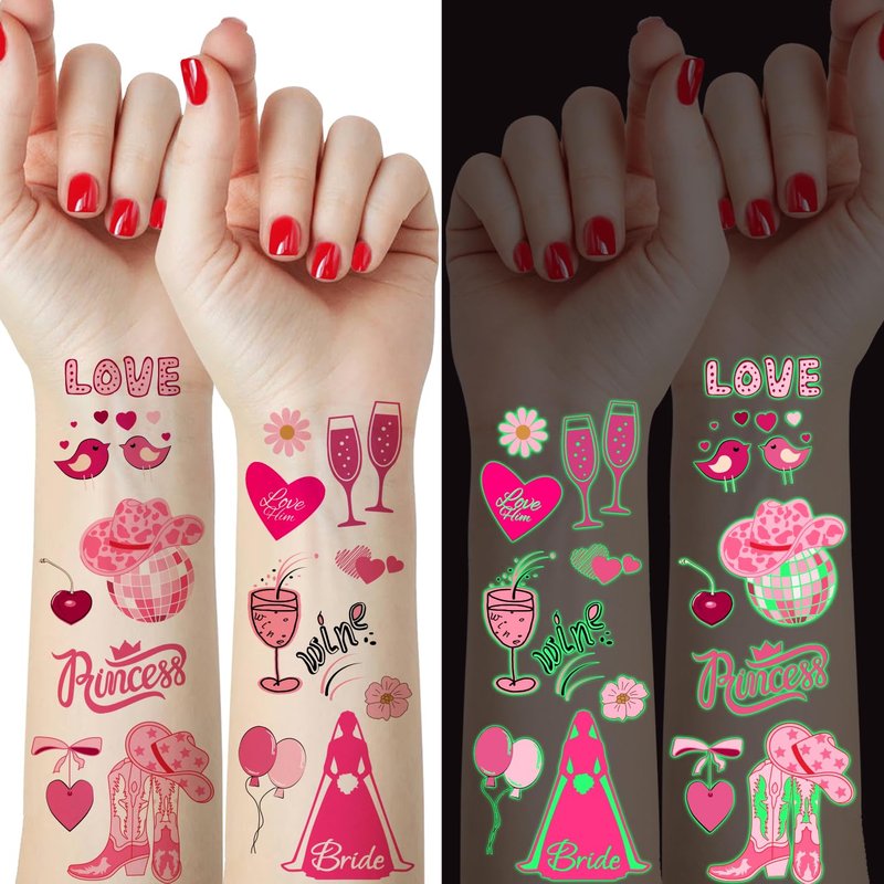 - Pink bachelorette temporary tattoos for Women: 2 sheets 50 pieces pink cowgirl tattoos temporary featuring hand-drawn designs like disco cowgirls hat, cowgirl boots, disco ball, princess, wine glasses, love, pink heart glasses and so on.