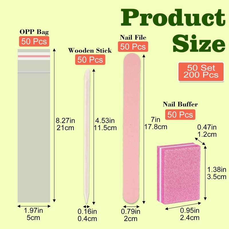 - Press on Nail Packing Kit: manicure supplies contains 50 sets of disposable manicure kits, including 50pcs mini nail buffers, 50pcs nail files, 50pcs nail cuticle sticks and 50pcs opp bags, enough quantity can meet your daily manicure needs.