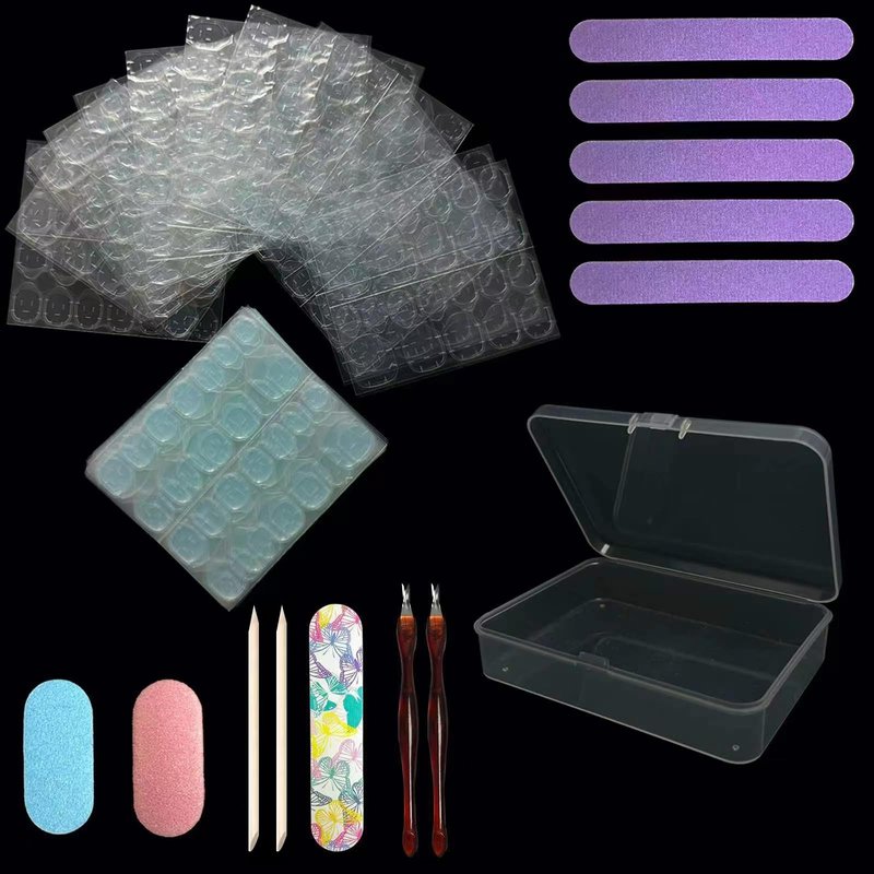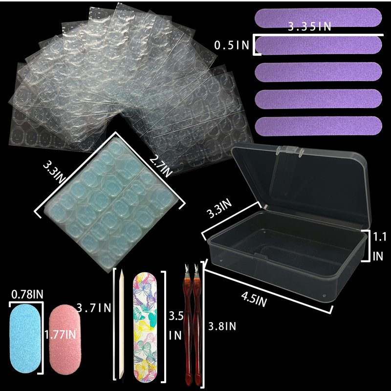 - 【What's in Package】 50 sheets(1200pcs) double sided adhesive tabs stickers for press on nails, 2 Mini Nail Buffer, 5 Mini Nail File, 2 Cuticle Pushers, 2 wooden stick, 1 Nail File stored in on small Plastic Box.