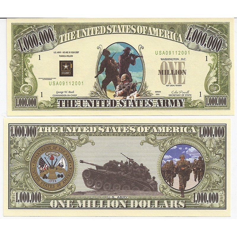 50 US Army Commemorative Million Dollar Bills with Bonus “Thanks a Million” Gift Card Set
