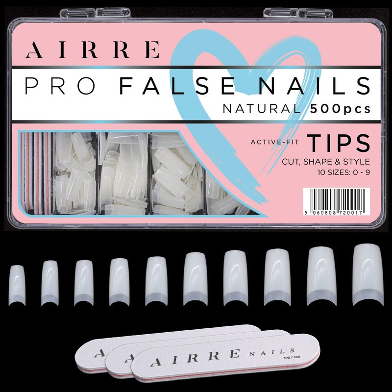 - 💖 ► PRO SALON NAILS ◄ AIRRE 500pcs Nail Tips + 3 Files are designed for acrylic manicures and used by Salon Nail Technicians, MUA's and Home DIY artists, they're even great for DIY beginners. Create a manicure that lasts with these sturdy, high-quality and light-weight nail tips. Made from professional Active ABS plastic to a perfect thickness for your manicured nails. Easily lasting 2-3 weeks with the correct application.