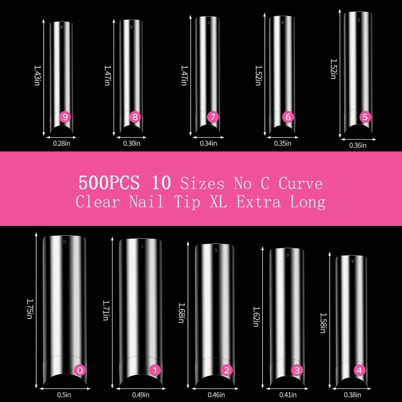 - 【What Will You Get?】10 Different sizes of tips for acrylic nails set with a total of 500 Pcs.Each size of clear acrylic nail tips has corresponding number,make easy for you differentiate and find the right long nail tips for your nail.Also trim tapered square nail tips the length and shape according to your own needs.XL no c curve acrylic nail tips perfect for nail salons and nail art beginners.Long fake nails tips quantity fully meets your needs,allow you have professional DIY nail art at home.