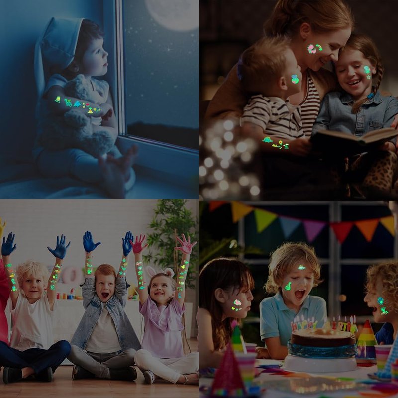 - 【Multiple occasions】Temporary tattoos for kids Perfect for kid birthday dinosaur party decorations, glow in the dark party supplies & favors, family gatherings, school events, the beach, Christmas, Easter, Halloween,etc. Even at a party with lots of friends, these fluorescent tattoo will make kids stand out from the crowd!
