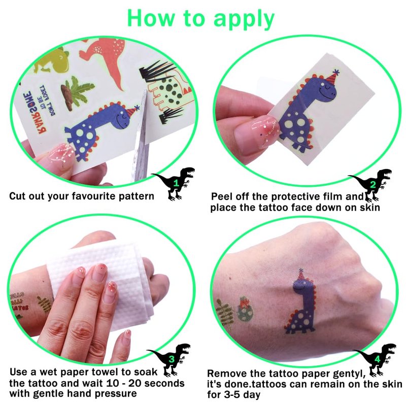 - 【Easy to use and waterproof】Kids temporary tattoos cut out your favorite design then apply it frontally to your skin, cover it with a damp paper towel or moisten it with water, then gently press the tattoo for about 10-20 seconds. Temporary tattoos are waterproof and will not fade as long as they are not rubbed. Each sheet measures 4.7" x 2.7". Our temp tattoos have been rigorously tested and can last 3-5 days.