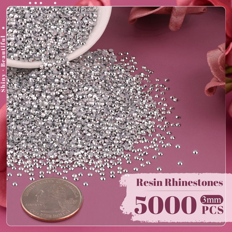 💎PACKAGE CONTENT -- The package contains approx. 5000 pcs of 3mm-SS12 (0.12") bling-out resin rhinestones (Sliver). The large amount will support you to fulfill a number of your wonderful DIY decoration ideas. Additionally, 1 tweezers and 1 pickup pen are included for easily picking up of glittering gems.💎TIPS FOR USE -- Non-hot fix flatback gemstones require adhesive for nail art, crafts, or artwork design. We recommend using B7000 rhinestone jewelry glue for DIY projects and UV / quick dry nail glue for nail art. To apply the resin rhinestones, first, clean the surface of your nails or the crafts you wish to embellish. Then, apply the rhinestones with the appropriate glue and wait for them to dry. (Please note that glue is not included.)💎WIDE APPLICATION -- These sparkling iridescent resin rhinestones are perfect for creating dazzling looks. Use them for face makeup, eye makeup, body art, 3D nail art or bedazzling DIY crafts like shoes, tumblers, mugs, bottles, phone cases, popsockets, scrapbooks, photo frames, diamond paintings, greeting cards, bags, glasses, guitars, keychains, hats, masks, hair clips, bracelets, wristbands, clothing, wedding dresses, and more. Apply it to what you want to bling!💎HIGHLIGHTS -- Resin rhinestones are packaged by weight, with each pack containing approximately 5000 pieces. Our store also offers a variety of colors and sizes of resin rhinestones. A sufficient amount of resin gems are suitable for paving large area designs such as diamond paintings or cups. By choosing resin rhinestones with similar or contrasting colors, you can create color-coordinated or highly contrasting works, such as phone cases with gradient effect or colourful festival decorations.