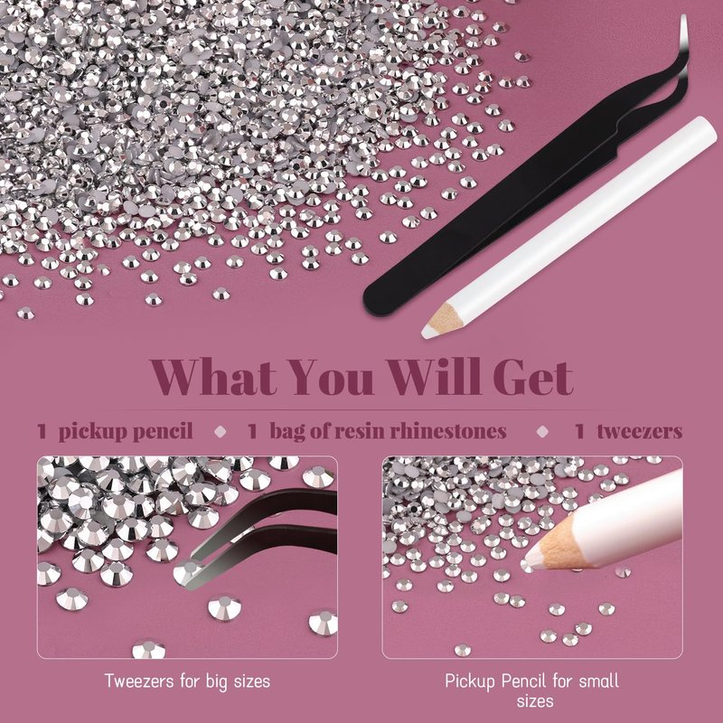 - 💎PACKAGE CONTENT -- The package contains approx. 5000 pcs of 3mm-SS12 (0.12") bling-out resin rhinestones (Sliver). The large amount will support you to fulfill a number of your wonderful DIY decoration ideas. Additionally, 1 tweezers and 1 pickup pen are included for easily picking up of glittering gems.