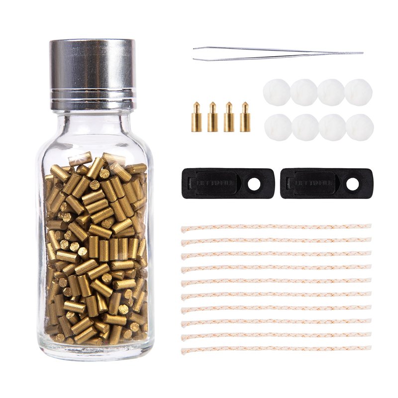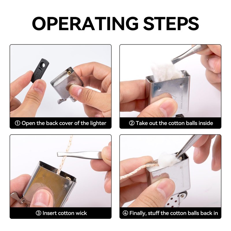 Package: 500Pcs Flint Refills & 10Pcs Cotton Balls & 1Pcs Tweezers & 8Pcs Cotton Balls & 4Pcs Spring Tips & 2Pcs Leather Pad.