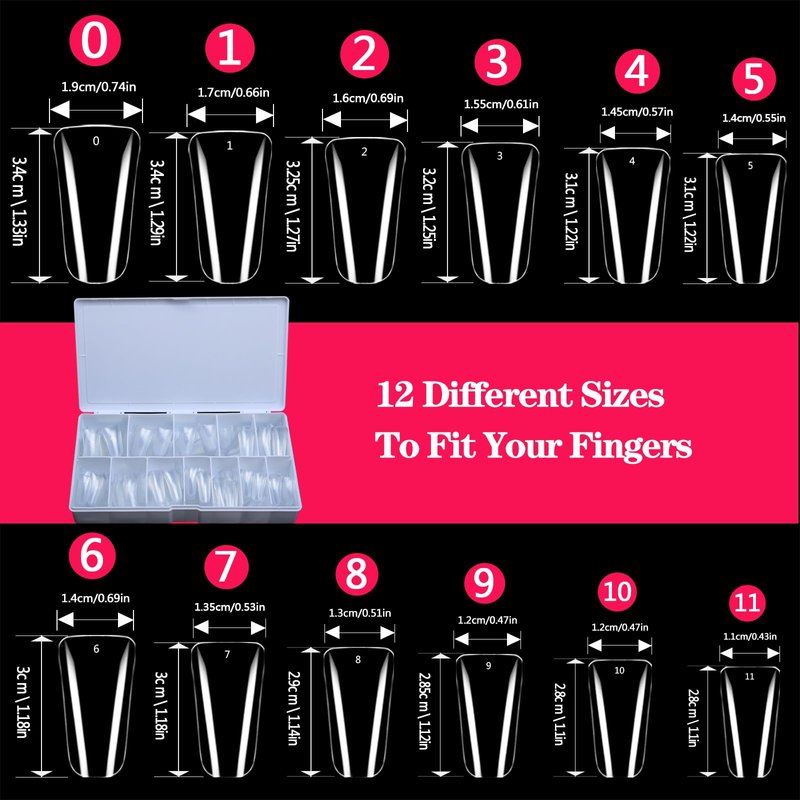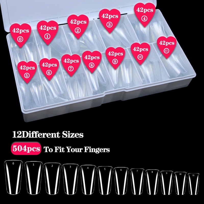 - 12 Sizes 504PCS Flare Duck Tips: Our 504pcs of clear full cover duck nail tips are available in 12 different sizes to fit most people's fingers. Duck tips for acrylic nails professional with 42 tips for each size in box, totally 504pcs. Enough quantity can satisfy your home DIY or nail salon needs.These Full-cover nail tips can be used for acrylic nails professional, dipping powder or duck press-on nails.