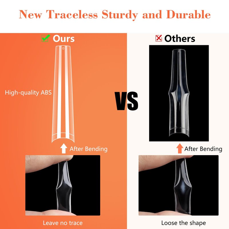 - 【Long-lasting & Sturdy & Durable】: Using high-quality ABS material, not soft and flimsy, not easy to crack. You can bend them & leave no mark behind. No c curve nail tips are easy to shape, you can use nail files to make many different types of false nails, like xxl coffin ballerina nails, long french nails and long stiletto false nails. Our french nail extension tips are easy to shape and can stick to the nail naturally, saving a lot of time for shaping and gluing!