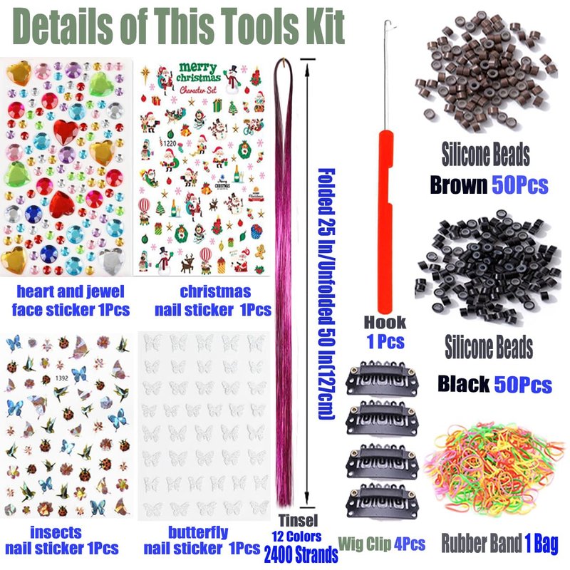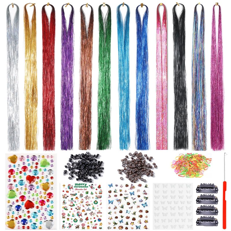 - ✿COMBINATION UPGRADE✿ The Tinsel Hair Extensions Kit Contains 12 Pcs Hair Tinsel Extensions In 12 Colors, 1 Crochet Hooks, 4 Hair Clips, 100 Micro-Linked Silicone Beads (50 Black And 50 Brown), 1 Heart Face Sticker, 3 Nail Stickers, A Pack Of Elastic Rubber Bands And An Instruction. Richer Configurations And Tools To Meet Your Diverse Needs For Beauty.