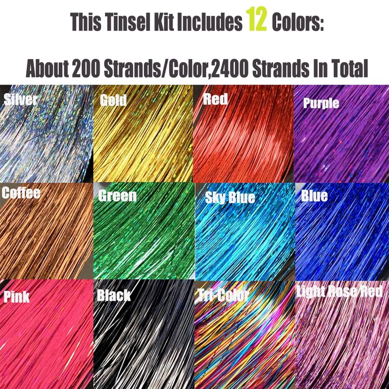 Color Of Hair Tinsel: There Are 12Colors, One For Each Color. They Are: Silver, Gold, Red, Deep Purple, Coffee, Grass Green,Lake Blue, Sapphire Blue, Pink, Black, Tricolor and Light Rose Red. 200 Strands/Piece, A Total Of 2400 Strands, With A Length Of 50 Inches, Which Can Meet Your Various Use Needs.