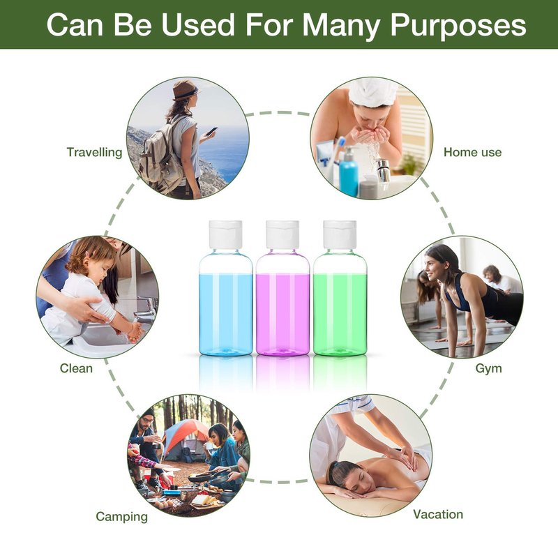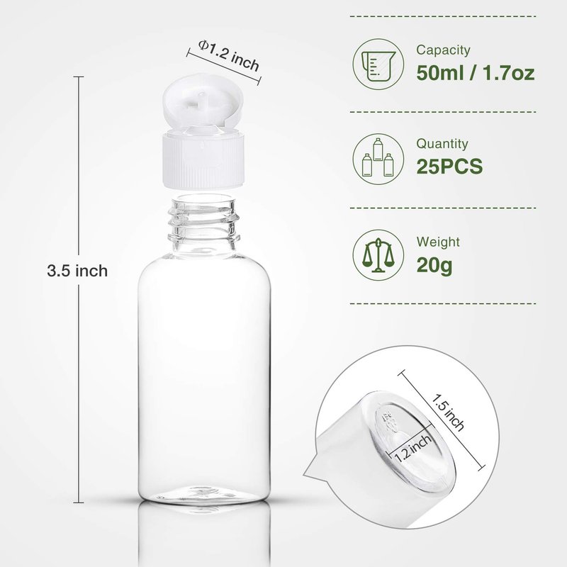 - 【Travel Size Bottles】Small plastic bottles measures only 3.5 inch in height and convenient to carry on airline. With capacity of 1.7oz(50ml), these travel bottles can hold enough toiletries for the business trip, vacation trip, travel, gym, school or outdoor activities etc. Also, it’s a good choice as sample bottles to your customers.