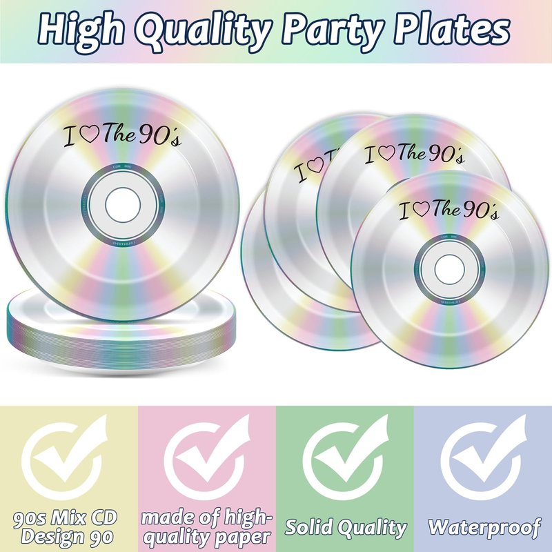 - Package includes: You'll get 25 pieces of 7in 90's mix CD plates, 25 pieces of 6.3in 90's party napkins. Brighten up your table setting with our 90's party plates and napkins supplies that exude a playful and celebratory atmosphere, ideal for birthday party or any festive occasion.