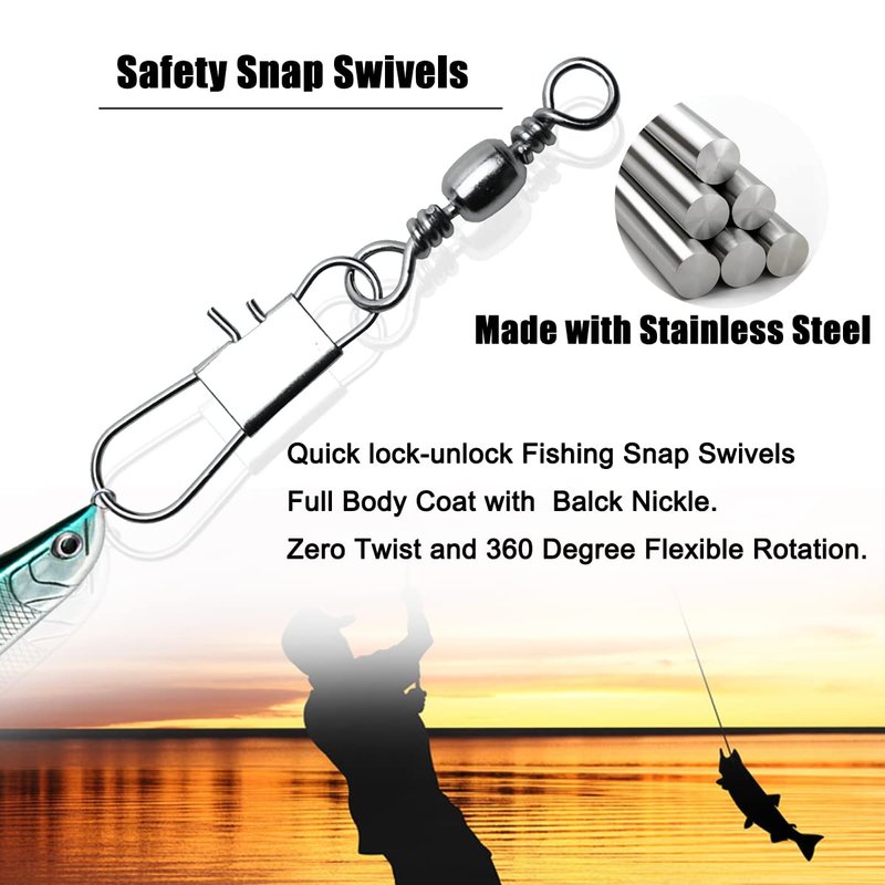 The interlock freshwater swivels are constructed from the highest quality stainless steel to obtain the highest strength, the fishing line safety snap connector offer a great way to save time on the water. This Premium Fishing tackle make change lures quick and easy without the hassle of cut and retying and eliminate line twists. Black nickel finish to the connector snaps swivel allows it to last much longer without rusting or corroding. This stainless safety lock fishing snap swivels ensure that you get the most out of every moment on the water.