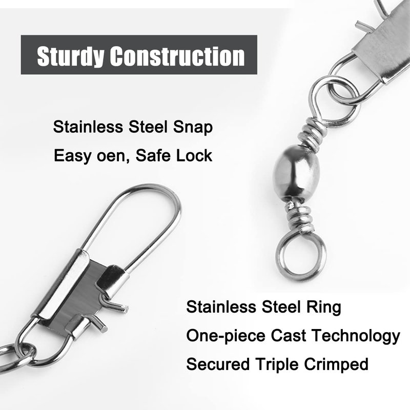 - LIGHTING CHANGE: Quick lock-open lock barrel snap swivel allows you to change fishing leaders or fishing lures in seconds. The stainless barrel swivels with safety snap work great for various rigs and leader trace making.