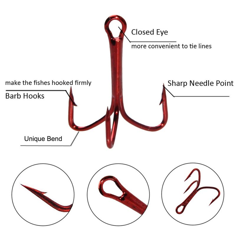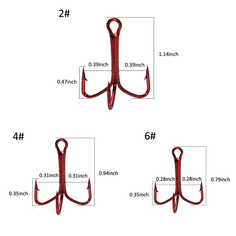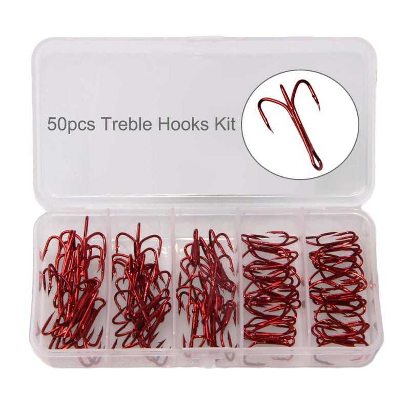 - What you Get: 50pcs red treble hooks for size 2#,4#,6#. 3 different sizes are well assorted in a reusable hard plastic box, perfect replacement for damaged hooks on your lure.